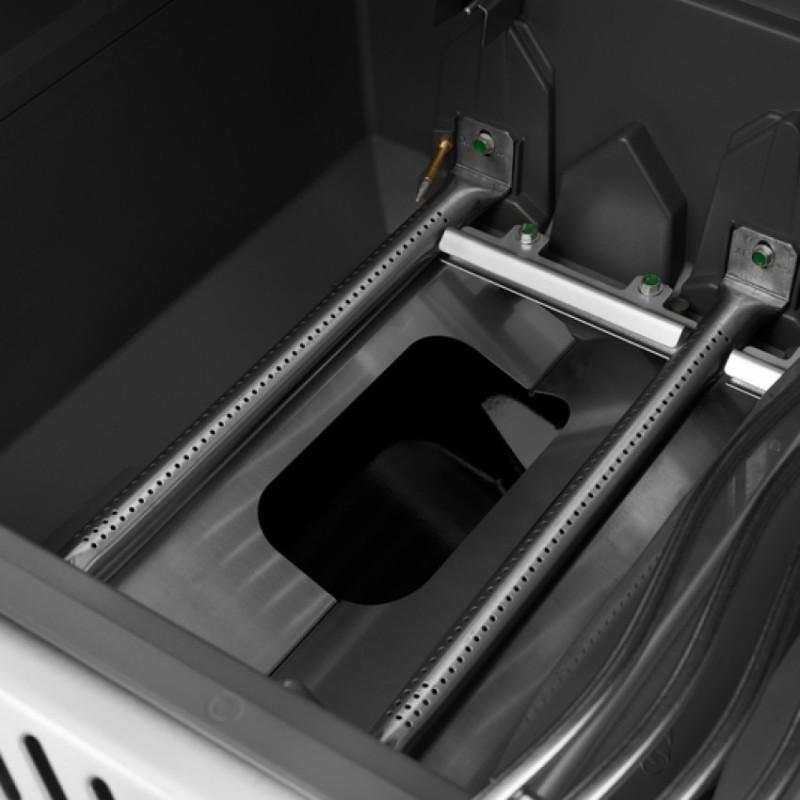 - Tuk a šťávy, které se nezachytí a neodpaří na krytech hořáků, jednoduše stečou do záchytné misky, která je umístěna pod grilovací vanou