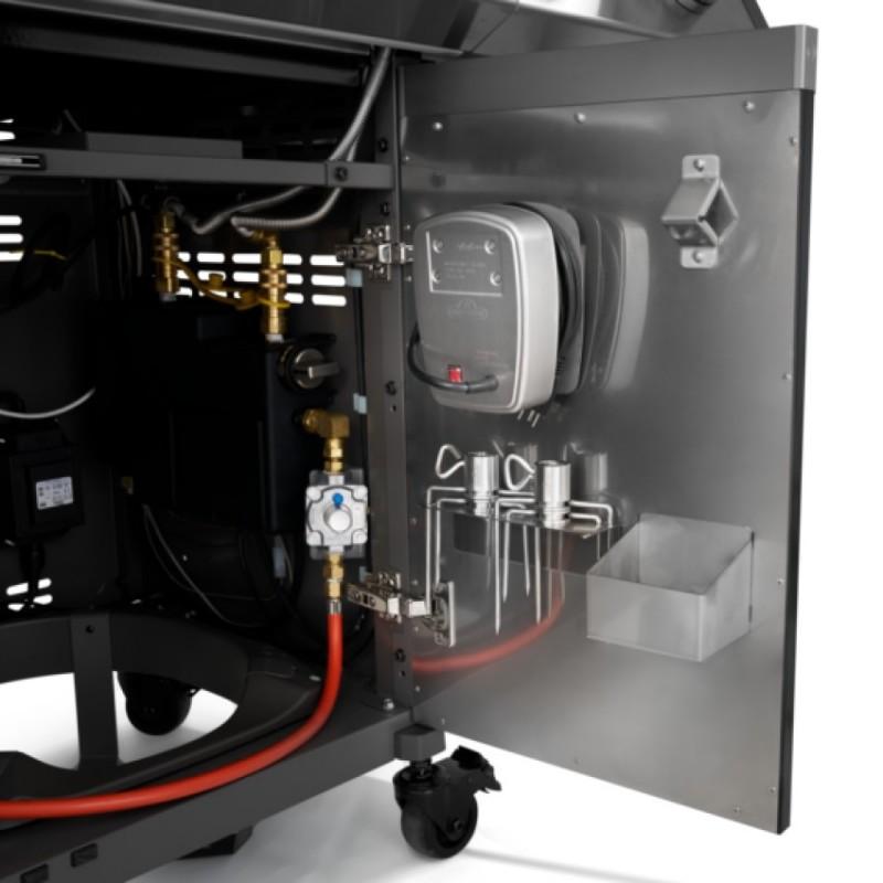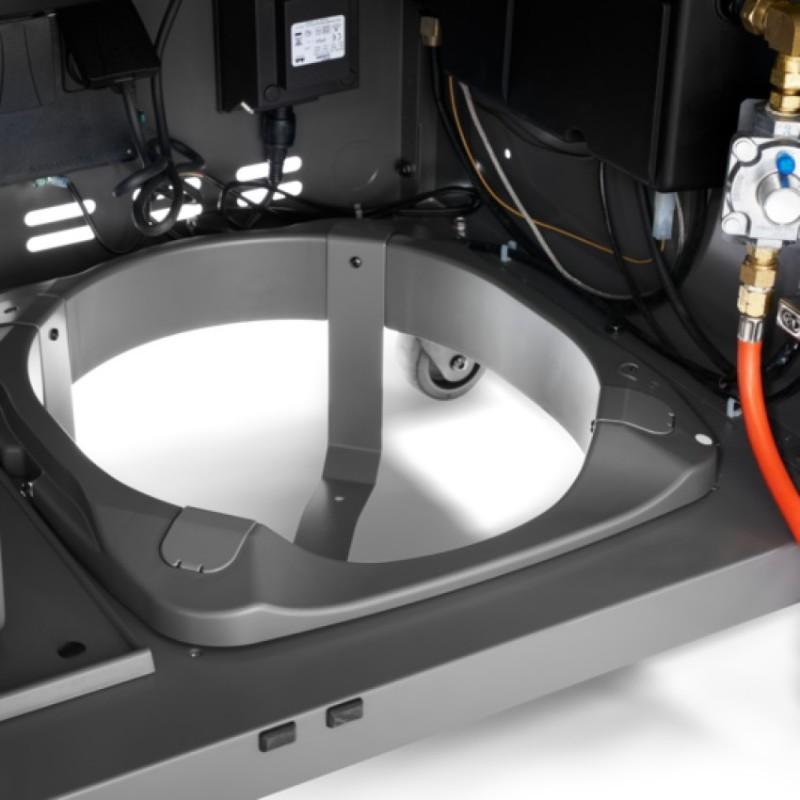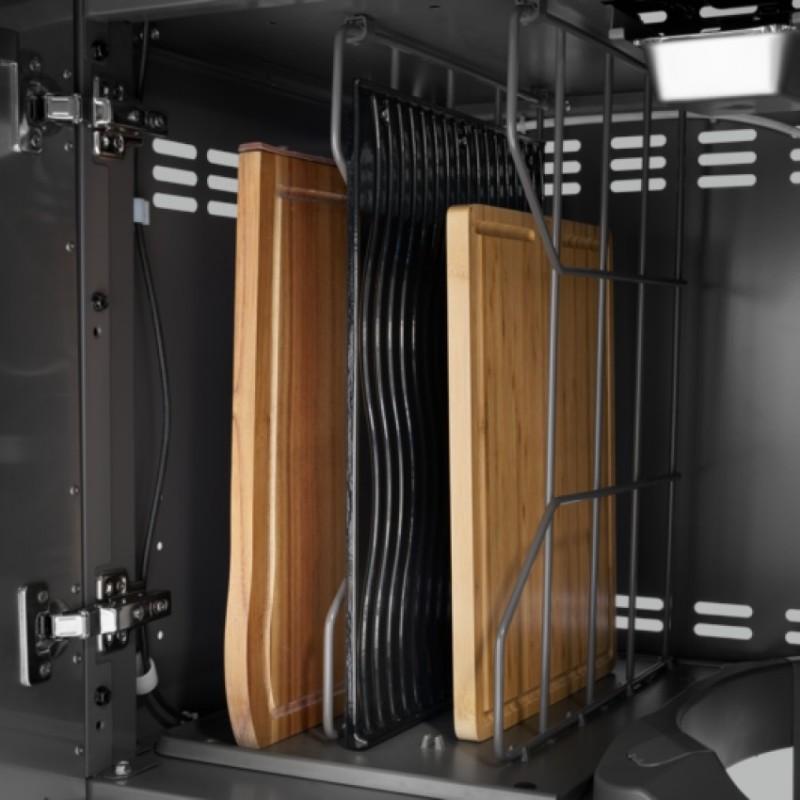 - Pod grilovací vanou je velkorysý úložný prostor v podobě skříně s dvoukřídlými dvířky, do které se vejde i 10 kg PB láhev