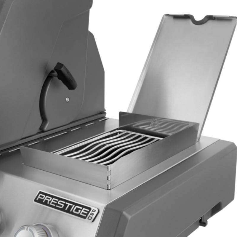 - Ke grilu lze zakoupit samostatný SmokerBox, který se připevňuje přímo ke grilu a umožní Vám uvnitř grilovací komory udit jak horkým, tak i studeným kouřem, přičemž teplotu pohodlně nastavíte přímo na digitální panelu grilu
