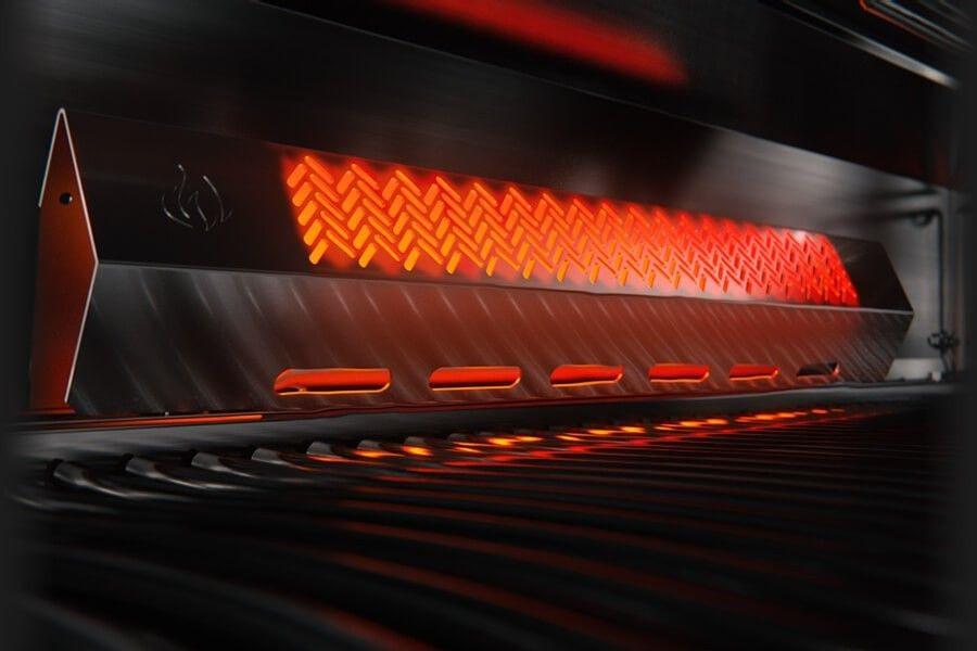 Gril má celkem 4+1 hořáky. Čtyři hlavní, nerezové, se speciálními kryty, aby se do jejich trysek nedostalo nic, co tam nepatří. Ty jsou navíc vybavené systémem vzájemného zapalování, takže když náhodou při zapalování nechytnou všechny, zapálí se navzájem o sebe. Gril dále disponuje zadním hořákem pro rotisserii.