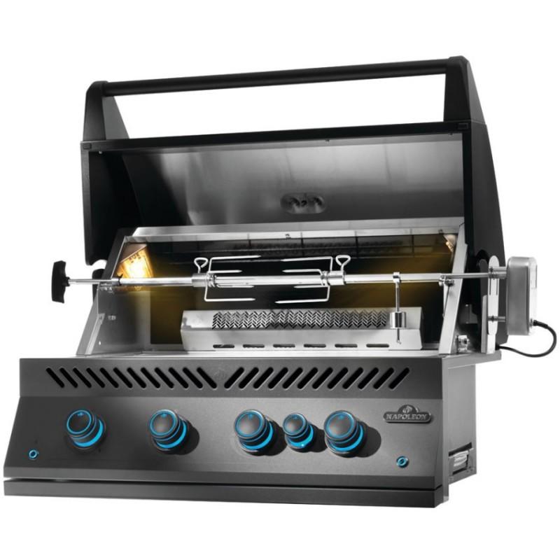 NOVINKA 2026. Napoleon vestavný plynový gril BIR 32 Phantom. Grilovací rošt: 70 x 45 cm, barva matná černá. 4 hlavní hořáky + zadní hořák pro rotisserii, systém zapalování JETFIRE, porcelánem smaltovaný litinový rošt WAVE, vestavěný teploměr .