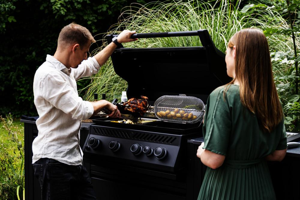 Stačí nasadit rožeň a můžete pomalu a rovnoměrně grilovat kuře, ale díky vysokému víku klidně i celou kýtu nebo malé sele.