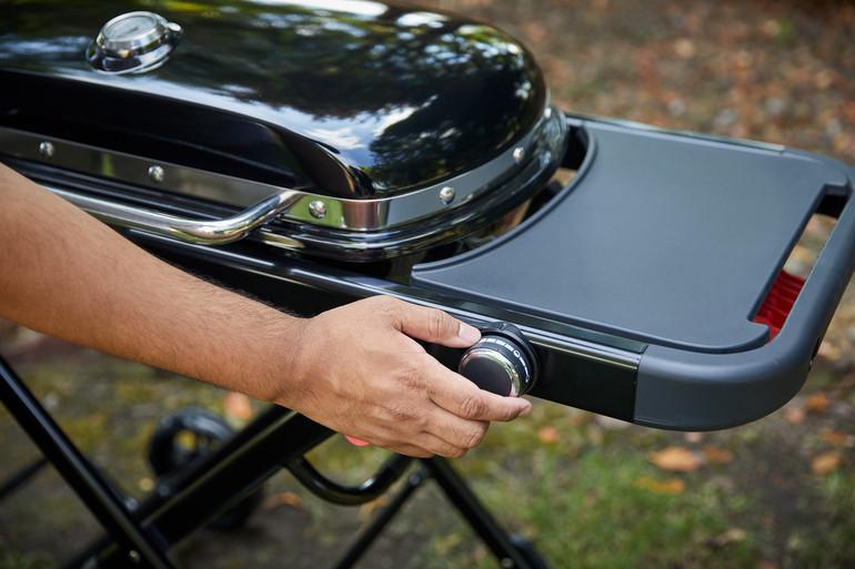 - Gril je připevněn k ocelovému vozíku - snadné skládání jednou rukou. Jednoduše stiskněte páku a gril se sám složí.