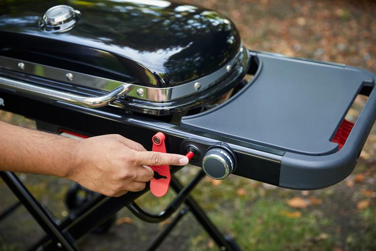 - Účelná skládací konstrukce pro optimální převážení grilu a integrovaný mechanizmus pro skládání a rozkládání grilu s automatickým zámkem víka při složení.